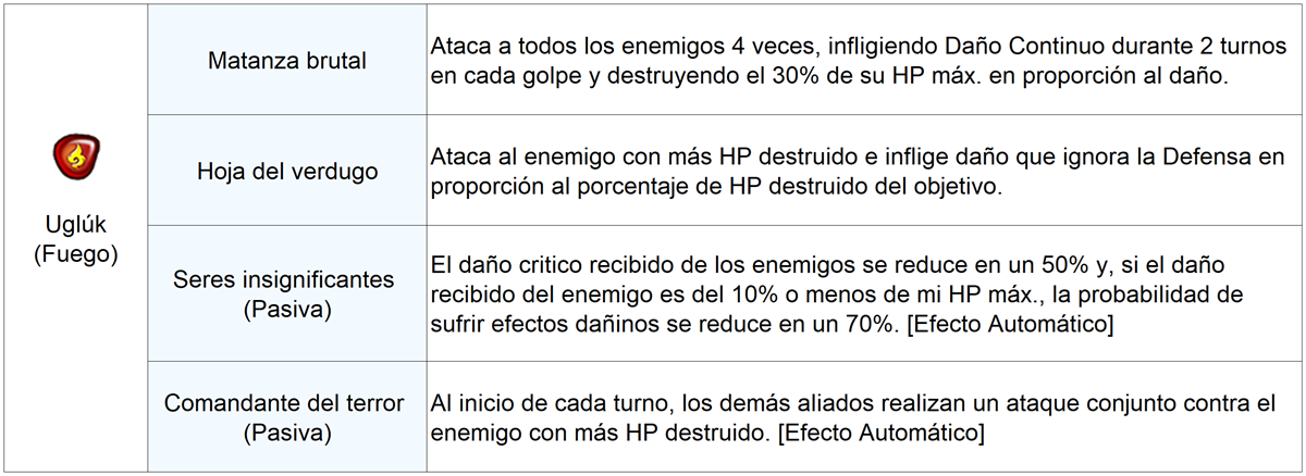 Según la información de las habilidades, en la batalla contra Uglúk, contar con Monstruos que puedan otorgar escudos continuamente a los aliados será de gran ayuda para completar el contenido. Como el HP destruido no se puede recuperar, una estrategia posible sería enfrentarlo de forma que el HP no disminuya desde el principio.
