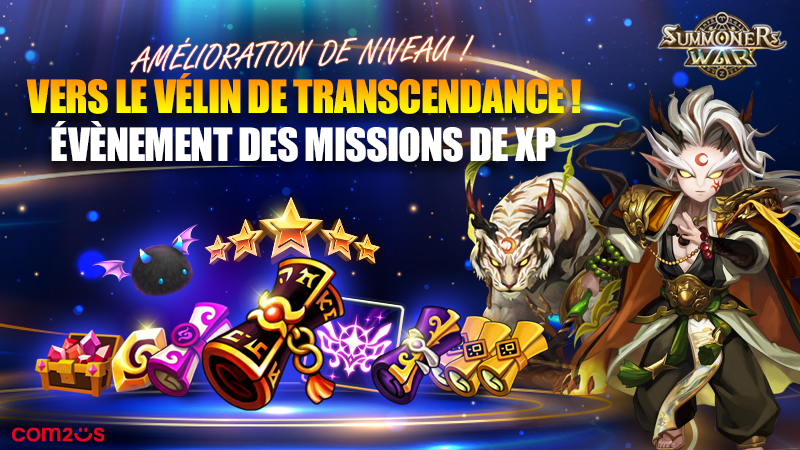 EVENT Amélioration de niveau ! Vers le vélin de transcendance ! Évènement des missions de XPSalutations de Com2uS !Accomplissez des missions et obtenez des XP pendant la période de l’évènement !Selon le total cumulé de XP obtenus, vous pourrez recevoir de nombreux cadeaux, dont [un vélin de transcendance, une bénédiction de l’invocation radieuse, un vélin Lumière et Ténèbres et un diablemon].Nous espérons que vous serez nombreux à participer !Retrouvez plus de détails ci-dessous !■ Durée de l'évènementDu 20 février à 03:00 au 12 avril à 16:59 (heure de Paris)Date limite de récupération des cadeaux : le 13 avril à 16:59 (heure de Paris)■ Détails de l'évènement★ À chaque mission d’obtention de XP accomplie, obtenez des XP et diverses récompenses selon la mission ! ★[Mission d'utilisation de la Chance d’Améria]- Toutes les 100 unités de Chance d’Améria utilisées : +15 XP (max. 3 900) / 30 000 pierres de mana (max. 7 800 000)* Si vous avez déjà utilisé la Chance d’Améria le jour de l’ouverture de l’évènement, elle sera appliquée rétroactivement.[Mission d'obtention de runes de 85 pts ou plus]- À chaque obtention d’une rune : +10 XP (max. 500) / 100 essences de rune (max. 5 000)[Mission d'invocation de monstres 4★ naturel ou sup.]- À chaque monstre invoqué : +10 XP (max. 500) / 1 vélin mystique (max. 50)[Mission de contenus compétitifs]- Tous les 5 combats dans l’Arène : +5 XP (max. 600) / +5 points de gloire (max. 600)- Par combat dans l’Arène World : +3 XP (max. 900) / +5 médailles de gloire (max. 1 500)- Par combat des Combats d’occupation : +3 XP (max. 360) / +5 points de guilde (max. 600)- Par combat du Combat de guilde World : +10 XP (max. 280) / +20 points de guilde (max. 560)- Par combat du Combat interserveur : +5 XP (max. 500) / +5 points de gloire (max. 500)* Les parties de [Combats d’occupation/Combat de guilde World] seront comptabilisées à partir de la semaine suivant celle de l’ouverture de l’évènement.[Missions de contenus de guilde]- À chaque pointage de guilde : +10 XP (max. 520) / +5 points de guilde (max. 260)- Par combat de Subjugation de monstres : +10 XP (max. 280) / +10 points de guilde (max. 280)- Tous les 5 combats dans le Labyrinthe de Tartaros : +10 XP (max. 100) / +10 points de guilde (max. 100)- Tous les 3 combats des Rivaux de Combat de guilde : +5 XP (max. 260) / +5 points de guilde (max. 260)* Les parties de [Subjugation de monstres] seront comptabilisées à partir de la semaine suivant celle de l’ouverture de l’évènement.★ Selon le total cumulé de XP obtenus, obtenez de nombreuses récompenses, dont un [vélin de transcendance et une bénédiction de l’invocation radieuse] ! ★<Cadeaux par paliers de total de XP obtenus>400 XP : 10 vélins mystiques800 XP : 3 pierres de réévaluation1 200 XP : 10 vélins de Feu1 600 XP : 1 vélin légendaire2 000 XP : 500 cristaux2 400 XP : 10 vélins d’Eau2 800 XP : 1 vélin Lumière et Ténèbres3 200 XP : 1 diablemon3 600 XP : 10 vélins de Vent4 000 XP : 1 vélin de transcendance + 1 bénédiction de l’invocation radieuse★BONUS★Après avoir obtenu un total de 4 000 XP, recevez [3 vélins mystiques] pour chaque tranche supplémentaire de 500 XP obtenus !- Tous les 500 XP suppl. obtenus : 3 vélins mystiques (max. 9 fois)★ Qu’est-ce que la bénédiction de l’invocation radieuse ?Lors de l’invocation d’un monstre 5★ naturel Feu/Eau/Vent, un monstre supplémentaire de même grade naturel Feu/Eau/Vent est invoqué, vous permettant de choisir l’un des deux monstres.Cet objet est utilisé immédiatement lors de l’invocation d’un monstre 5★ naturel d'attribut Feu/Eau/Vent.※ À lire avec attention================================"- Pour les invocateurs de nv. 49 ou inférieur, la difficulté des [Mission d'utilisation de la chance d’Améria] et [Mission d'obtention de runes de 85 pts ou plus] est réduite. Cette difficulté restera la même, et ce même si le nv. 50 est atteint pendant l'évènement.================================[Mission d'obtention de runes de 85 pts ou plus]- Les runes obtenues via le Crafting et les évènements seront également comptabilisées.- Les runes déjà améliorées au moment de leur obtention ne seront pas comptabilisées.[Mission d'invocation de monstres 4★ naturel ou sup.]- Les invocations mystiques consommant des cristaux, ainsi que les invocations mystiques gratuites via l’Abonnement Invocation, seront également comptabilisées. En revanche, les invocations effectuées à l’aide de pièces/morceaux de vélin de monstre ne seront pas comptabilisées.[Mission de contenus compétitifs]- Pour l’Arène, les combats d’Arène et ceux contre les Rivaux de l'Arène seront comptabilisés ; pour l’Arène World, les combats de classement / de Ligue spéciale / de Combat défi seront comptabilisés. Les matchs amicaux de l’Arène World ne le seront pas.- Le nombre de parties jouées pour chaque contenu est comptabilisé à la fin du combat, après être entré sur le champ de bataille.[Missions de contenus de guilde]- Pour la Subjugation de monstres, seul le premier combat de chaque round (1er et 2e) est pris en compte chaque semaine.- Pour le Labyrinthe de Tartaros, seuls les combats victorieux sont pris en compte. Pour les combats à durée limitée, la prise en compte se fait à la fin du combat.================================- Les récompenses sont disponibles 24h après la fin de l'évènement.- Redémarrez le jeu si vous jouez au début de l'évènement afin d'éviter tout retard. - Redémarrez le jeu si vous ne trouvez pas une de vos récompenses dans votre boîte de réception.- La durée de l'évènement et le temps restant seront affichés selon le fuseau horaire de la zone où vous résidez.- Des commentaires ou suggestions ? Rendez-vous sur https://customer.withhive.com/com2us/ask/313