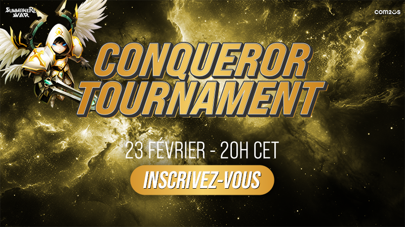 OTHERS Conqueror Tournament - Inscriptions ouvertes !Les inscriptions pour notre prochain Tournoi Conquérant ouvrent dès maintenant ! Si votre meilleur classement en fin de saison en Arène Mondiale est Conquérant 1 à 3, c’est votre chance d’affronter des joueurs de votre niveau et de remporter de superbes récompenses ! Les inscriptions commencent dès maintenant et sont ouvertes jusqu’au lundi 23 février à 18h00 (CET). Le tournoi aura lieu le lundi 23 à 20h00 (CET), dans un format Bo3 / Bo5 - mode SWC. Les participants pourront gagner des cristaux ainsi que des récompenses supplémentaires, comme des goodies Com2uS et un Apple iPad. Intéressé(e) ? Cliquez sur le lien vers le formulaire d’inscription et inscrivez-vous dès maintenant ! Suivez toute l’action en direct sur : ttv/TitoGoflette