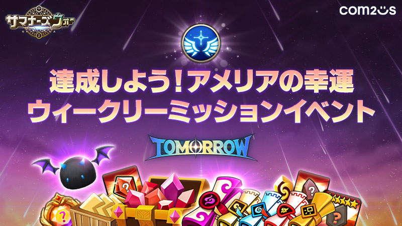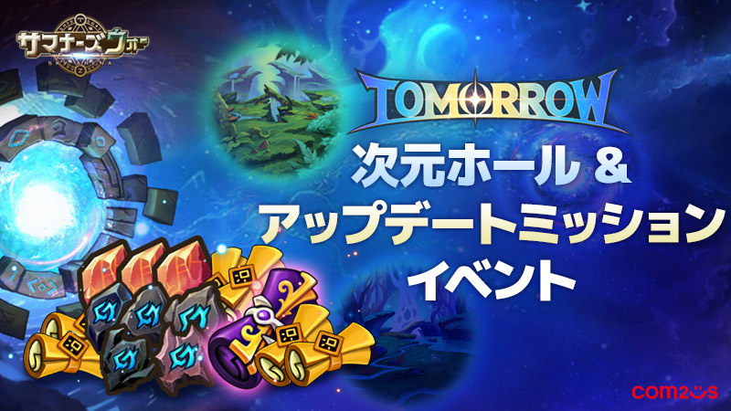 EVENT ★TOMORROWアップデート記念★次元ホール&アップデートミッションイベントいつも『サマナーズウォー』をプレイしていただき、誠にありがとうございます。『サマナーズウォー』のTOMORROWアップデートを記念して★次元ホール&アップデートミッションイベント★が開催されます。イベント期間中に次元ホールをクリアして [ルーン原石、不思議な召喚書、伝説の召喚書]などの報酬をGETしましょう!TOMORROWアップデートで変化を遂げた次元ホールについての詳しい内容は、アップデートのお知らせをご確認ください。[v9.0.0アップデートのお知らせはコチラ]■ 期間アップデート実施後(サーバー別)~2025年12月21日 23:59(各サーバー時間基準)*報酬の受取期限:2025年12月22日 23:59(各サーバー時間基準)■ 詳細EVENT1. 期間中に次元ホールエネルギーを消費して報酬をGET!<次元ホールエネルギー消費報酬>- 合計300個消費:古代の魔石×200、ルーン原石(種類選択)×100- 合計600個消費:古代の魔石×200、ルーン原石(種類選択)×100- 合計900個消費:不思議な召喚書×5、マナストーン+500,000- 合計1,200個消費:古代の魔石×200、ルーン原石(種類選択)×100- 合計1,500個消費:古代の魔石×200、ルーン原石(種類選択)×100- 合計2,000個消費:伝説の召喚書×1EVENT 2. アップデートミッションをクリアして不思議な召喚書をGET!<アップデート記念ミッション!>- 混沌の神殿1回プレイ:不思議な召喚書×2- チャレンジバトル1回プレイ:不思議な召喚書×2- 次元ホールで古代ルーンダンジョン10回プレイ:不思議な召喚書×2*アップデート記念ミッションはダンジョンをクリアできなかったり敗北したりした場合でもカウントされます。※チェック!=================================*イベント報酬はイベント終了の24時間後までにお受け取りください。*イベント開始前からゲームをプレイしていると、イベント適用が遅れる場合がございます。お手数ですが、アプリを再起動してからご参加ください。*報酬が見当たらない場合はアプリを再起動してプレゼントボックスをご確認ください。*イベント期間及び残り時間はお住まいの国のタイムゾーンで表示されます。*お問い合わせ:https://customer.withhive.com/com2us/ask/313
