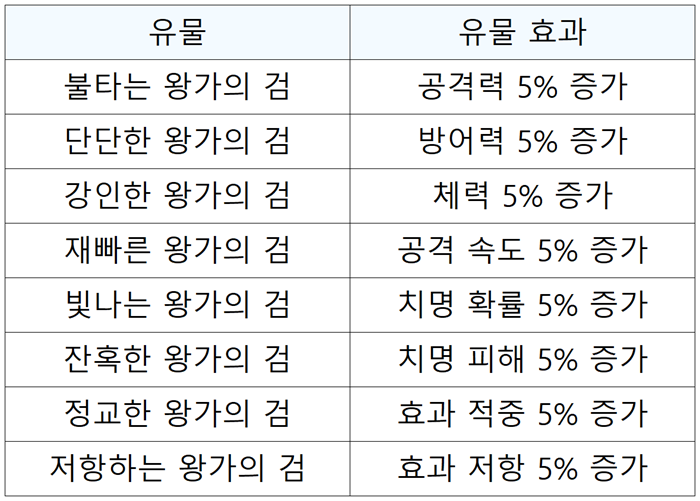 왕가의 검의 경우 다음과 같은 효과를 가집니다.