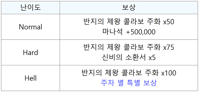 Normal 난이도 50층을 클리어하면 반지의 제왕 소환서가 보상으로 제공될 예정이오니 잊지 말고 꼭 도전해 보시길 바랍니다.