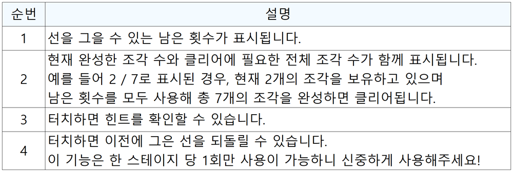 아울러 주어진 선 긋기 횟수를 남기거나 초과한 경우와 주어진 목표의 조각보다 더 많은 도형이 나왔을 때는 스테이지가 실패 처리된다는 점을 기억해 주시면 좋을 것 같습니다.