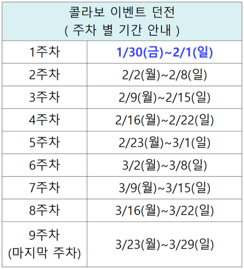 아울러 이번 이벤트 던전 일정은 1월 30일부터 2월 1일까지가 1주 차, 그리고 2월 2일부터 바로 2주 차가 시작될 예정입니다.