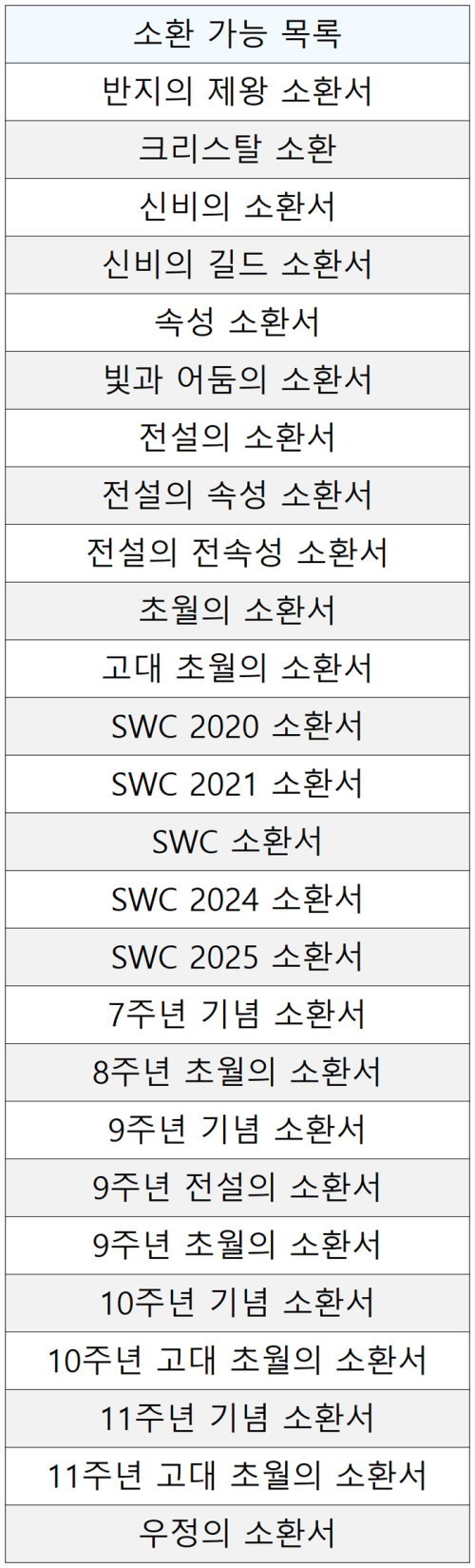 - 반지의 제왕 콜라보 캐릭터만이 소환되는 전용 소환서로 (물/불/바람/빛/어둠) 반지의 제왕 콜라보 캐릭터가 소환될 수 있습니다.
