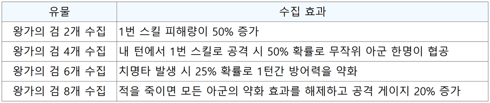 왕가의 검의 경우, 수집 개수에 따라 다음과 같은 특수 효과가 추가로 부여됩니다.