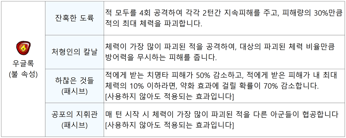 스킬 정보로 확인했을 때는 우글록과의 전투에서는 아군에게 실드를 끊임없이 부여할 수 있는 몬스터들이 있다면 클리어에 큰 도움이 될 것 같습니다.