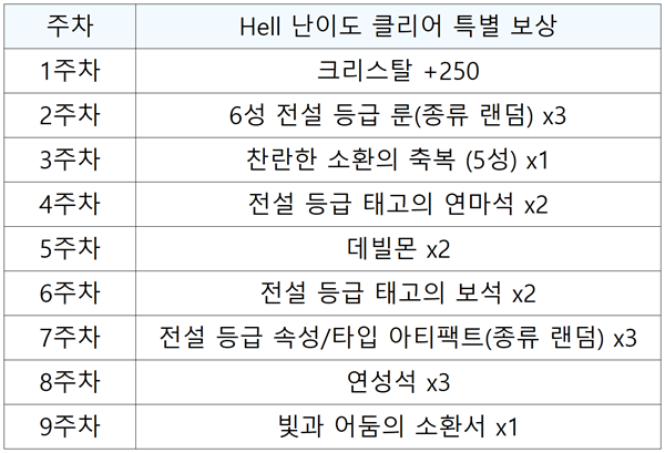이벤트 던전은 매주 초기화되며, 한 주마다 마지막 Hell 난이도의 이벤트 던전을 클리어할 시, 주차 별 특별 보상을 획득할 수 있는데요,