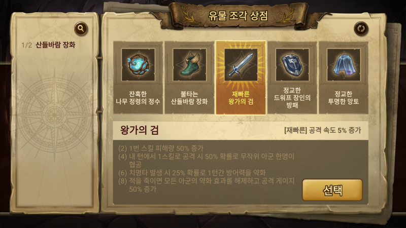 유물 조각 상점에서는 왕가의 검, 고대 엘프의 숨결, 나무 정령의 정수, 별빛 가루, 서리빛 거울 조각 등등 15종의 유물이 제공될 예정인데요.