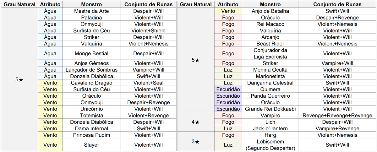 - Todos os Monstros são fornecidos com 6★ no Nv. 40, níveis de habilidade no MÁX e equipados totalmente com Runas e Artefatos.