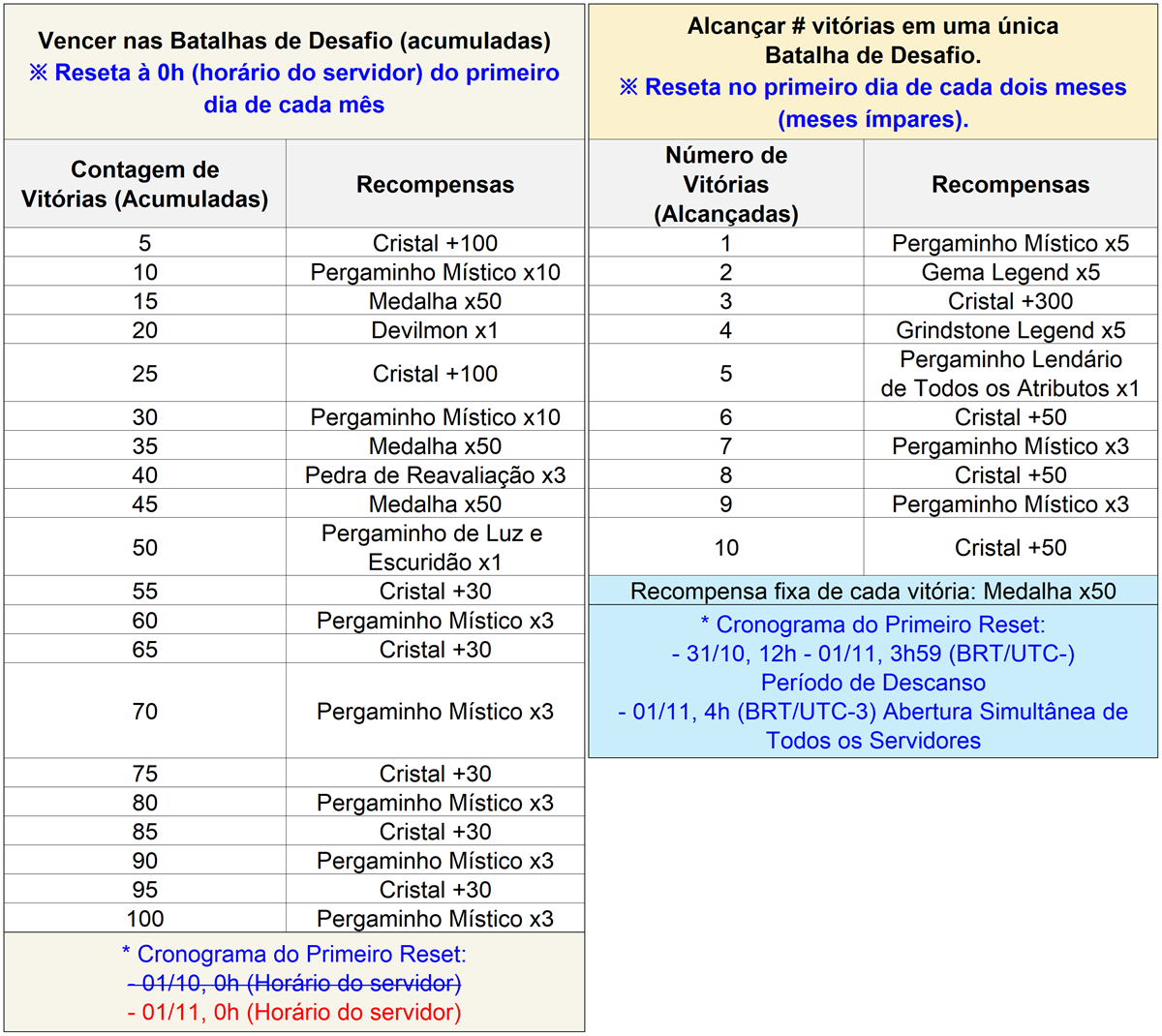 - [Recompensas da Batalha de Desafio (Vitórias Totais)]: Reseta no dia 1º de cada mês, à 0h (horário do servidor).