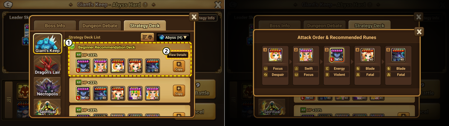 : O menu [② Ver Detalhes] mostra as configurações de Runas recomendadas e a ordem de ataque para cada Monstro no deck.