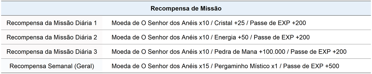 - Você receberá três Missões Diárias à 0h e cinco Missões Semanais todas as segundas-feiras (horário do servidor).