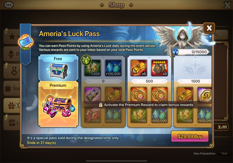 - 艾美莉亞的幸運通行證可透過[商店 > 特價 > 通行證]或連續戰鬥畫面查看。