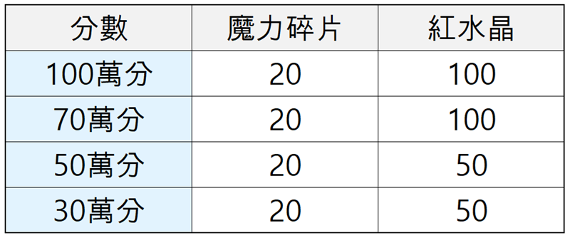 達成獎勵:於戰鬥中達標指定分數後即可獲得。