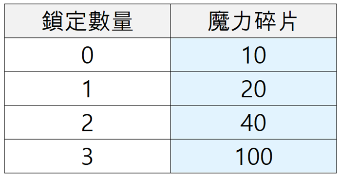 : 可鎖定最多3個副屬性,鎖定的副屬性類型與強化度皆保持不變。根據鎖定的副屬性數量,所需「魔力碎片」數量如下。