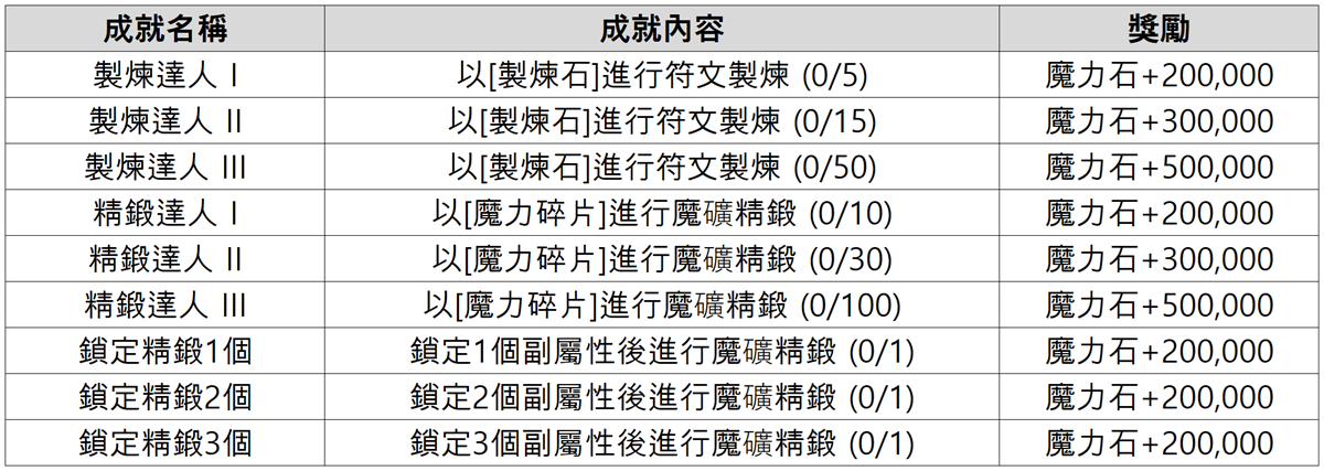 ▶ [任務 > 成就]新增與符文製煉及魔礦精鍛相關的全新成就。