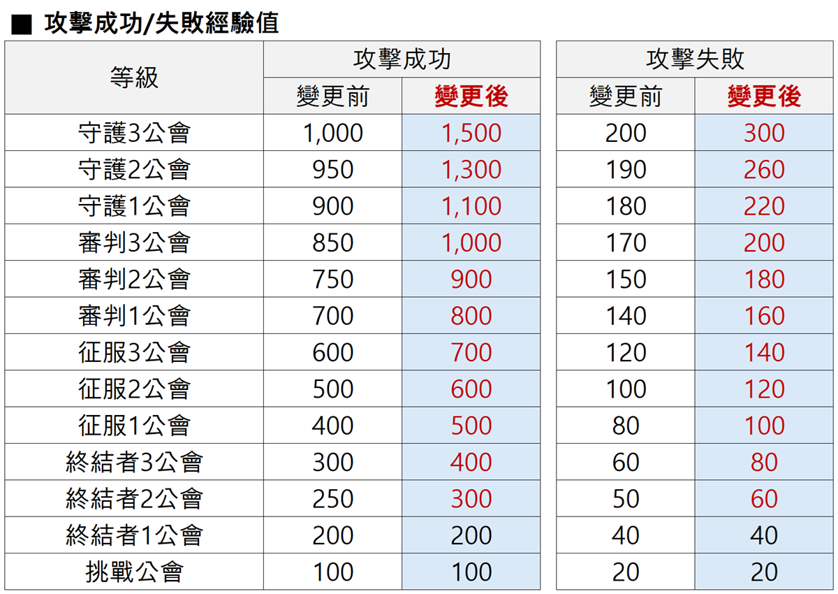 - 提升根據攻擊成功/失敗結果發放的據點戰經驗值。