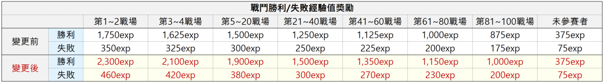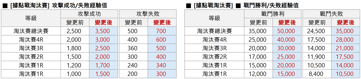 - 提升參與據點戰淘汰賽可獲得的經驗值。