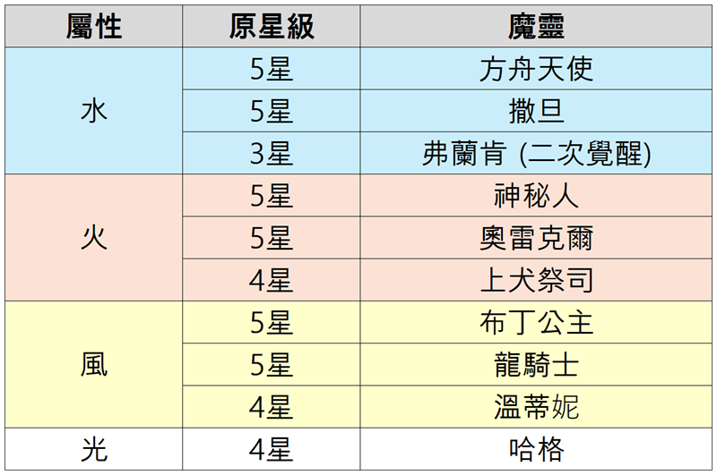 - 新增由火/水/風屬性共15種原5星魔靈組成的專屬召喚列表。