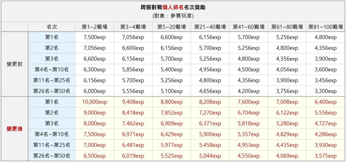 - 提升競技場跨服對戰結束後,根據個人排名發放的名譽經驗值獎勵。