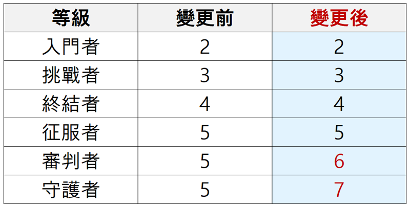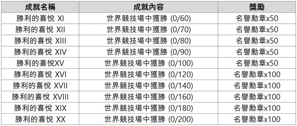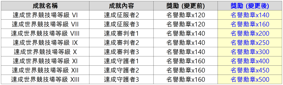 - 提升世界競技場中,審判者及守護者等級獲勝時獲得的名譽勳章獎勵。