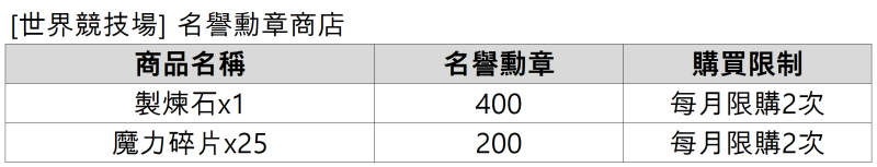 - 於世界競技場名譽勳章商店中,全新上架製煉石及魔力碎片兩種商品。