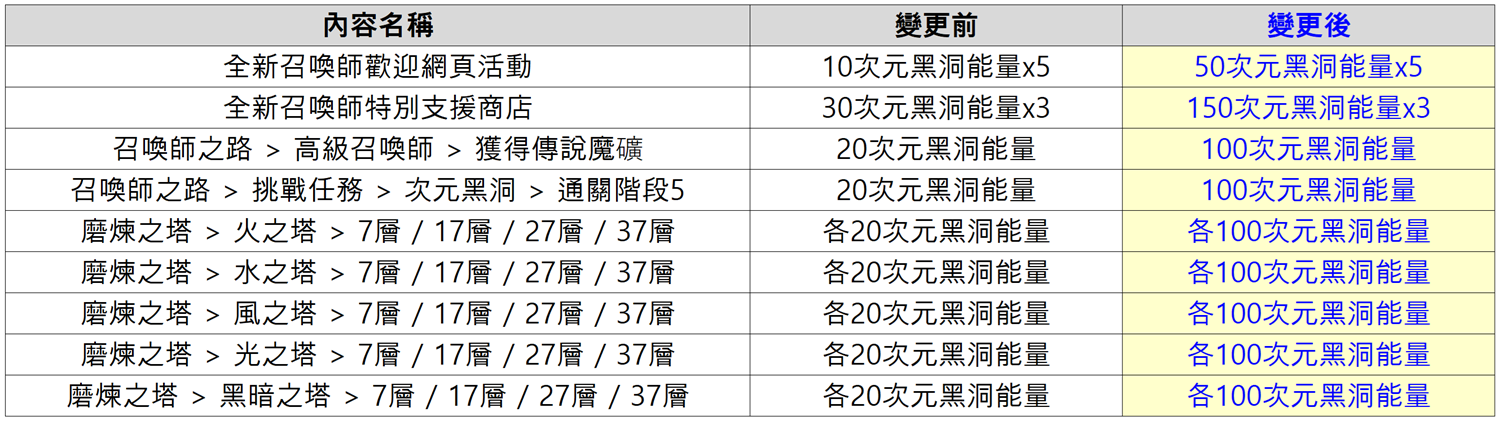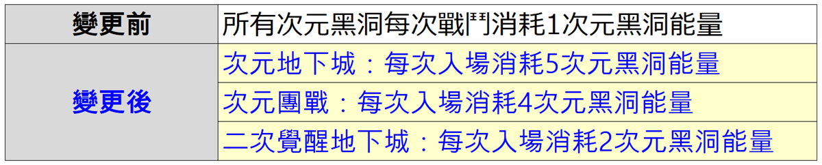 - 提升[次元黑洞能量]補充速度及持有量上限。