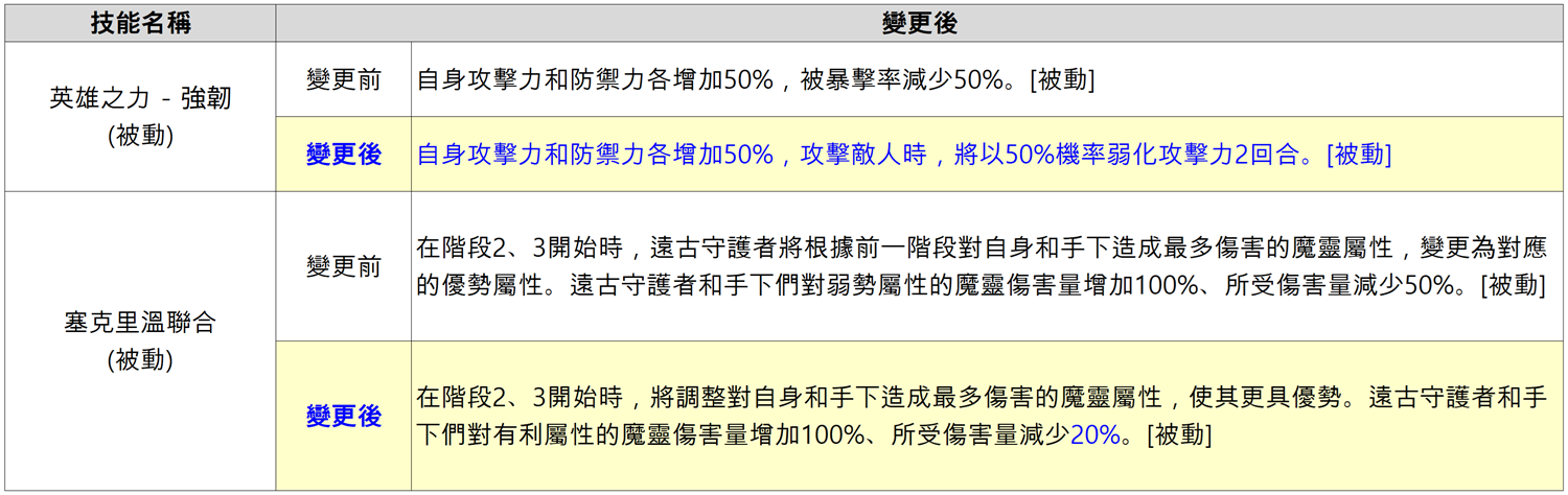 : [塞克里溫次元 – 被遺忘的英雄古城]遠古守護者技能調整如下。