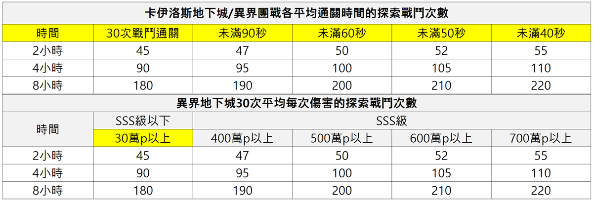 根據30次連續戰鬥中的最低戰鬥等級與平均造成傷害,增加探索戰鬥通關等級和次數。