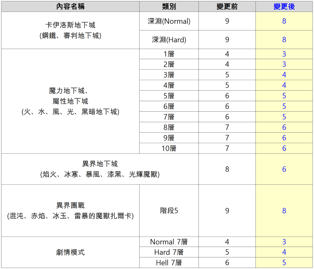: 大幅下調所有次元地下城階段1~5難度,並減少關卡怪物及手下體力及遠古守護者(階段1~3)的體力。