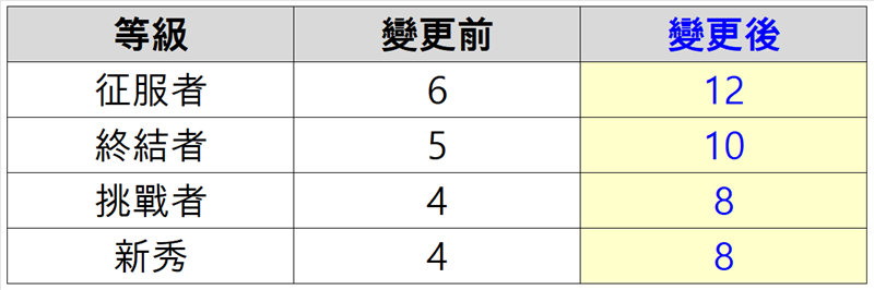 - 上調競技場獲勝時,根據等級獲得的名譽分數。